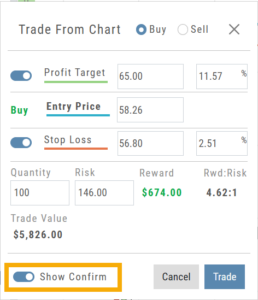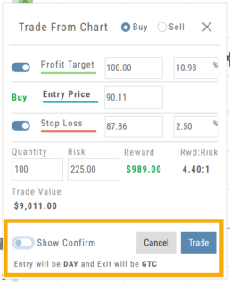Trade from the Chart: Use the control box or lines on Chart to adjust the entry point, Target Price and/or Stop Price.